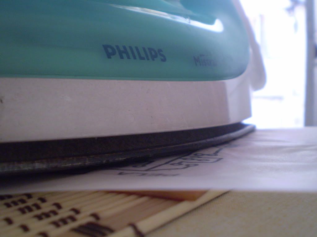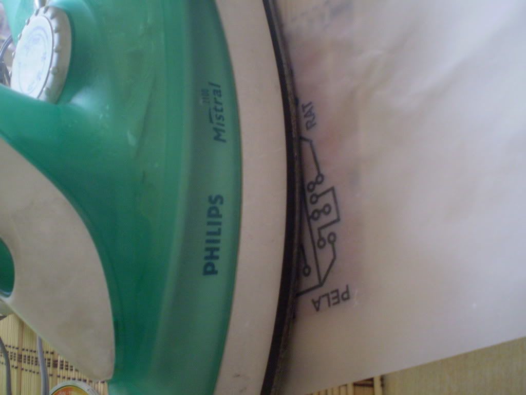 Primero hay que tener el plano de la plaqueta para eso yo lo pase a corel y jpg. A este plano hay que imprimirlo en el papel vegetal o sacarle una fotocopia( tiene que ser con una impresora laser o fotocopiadora). Recordemos que el plano lo tenemos que imprimir dado vuelta. Ese plano impreso al reves en el papel vegetal con las medidas de 10 x 10 (siempre fijense que entre bien en la plaqueta que compraron que tiene que ser de 10x10) lo vamos a presentar en la plaqueta y luego con la plancha no muy caliente se lo empezamos a pasar por encima del papel vegetal, siempre la tinta que tiene el papel impreso tiene que estar hacia la plaqueta jejeje ( por eso decia que hay que imprimir el plano al reves, pork cuando lo plnachemos sobre la plaqueta este le va a pasar la tinta a la plaqueta y asi marca el circuito de la forma correcta.